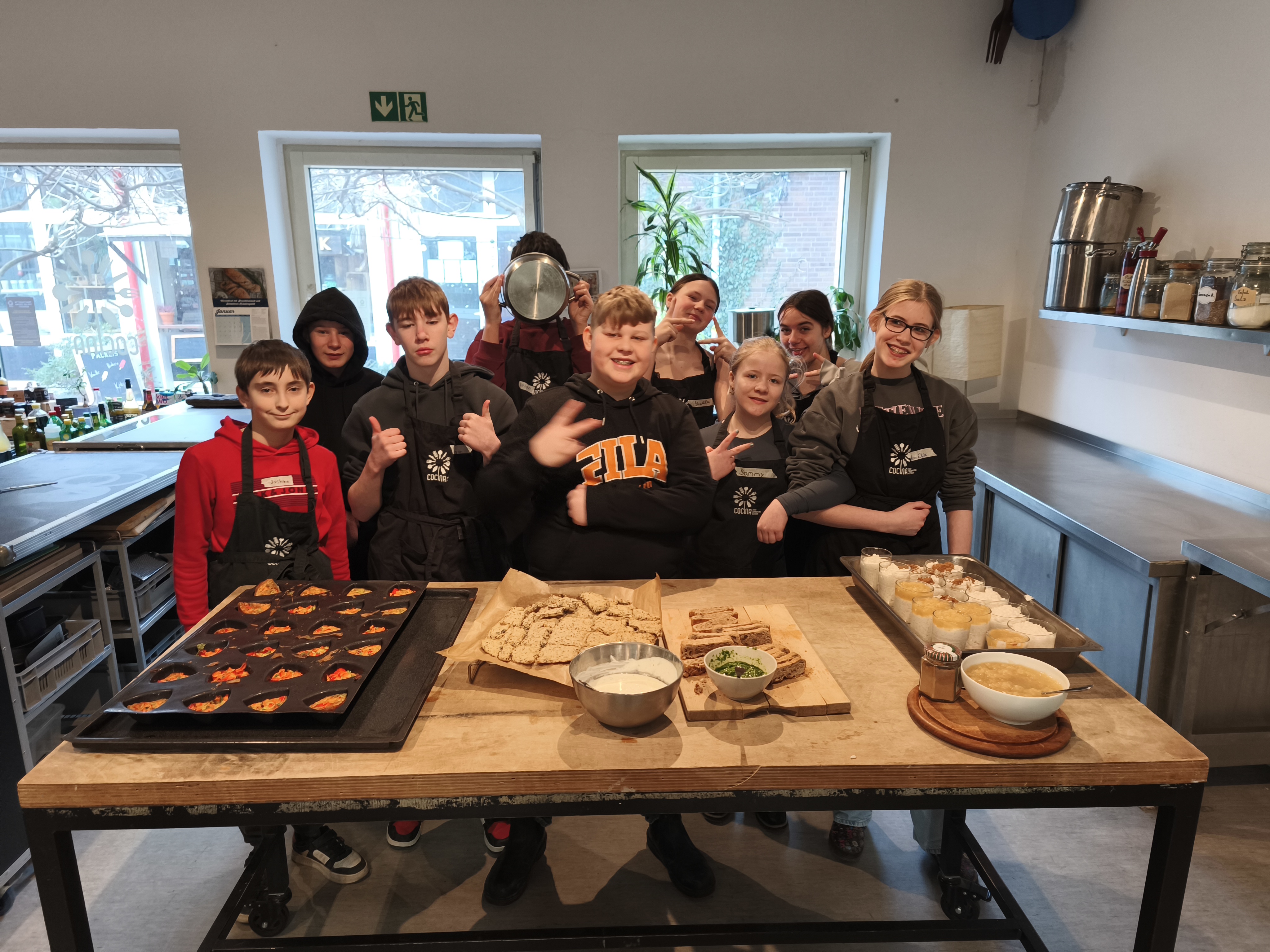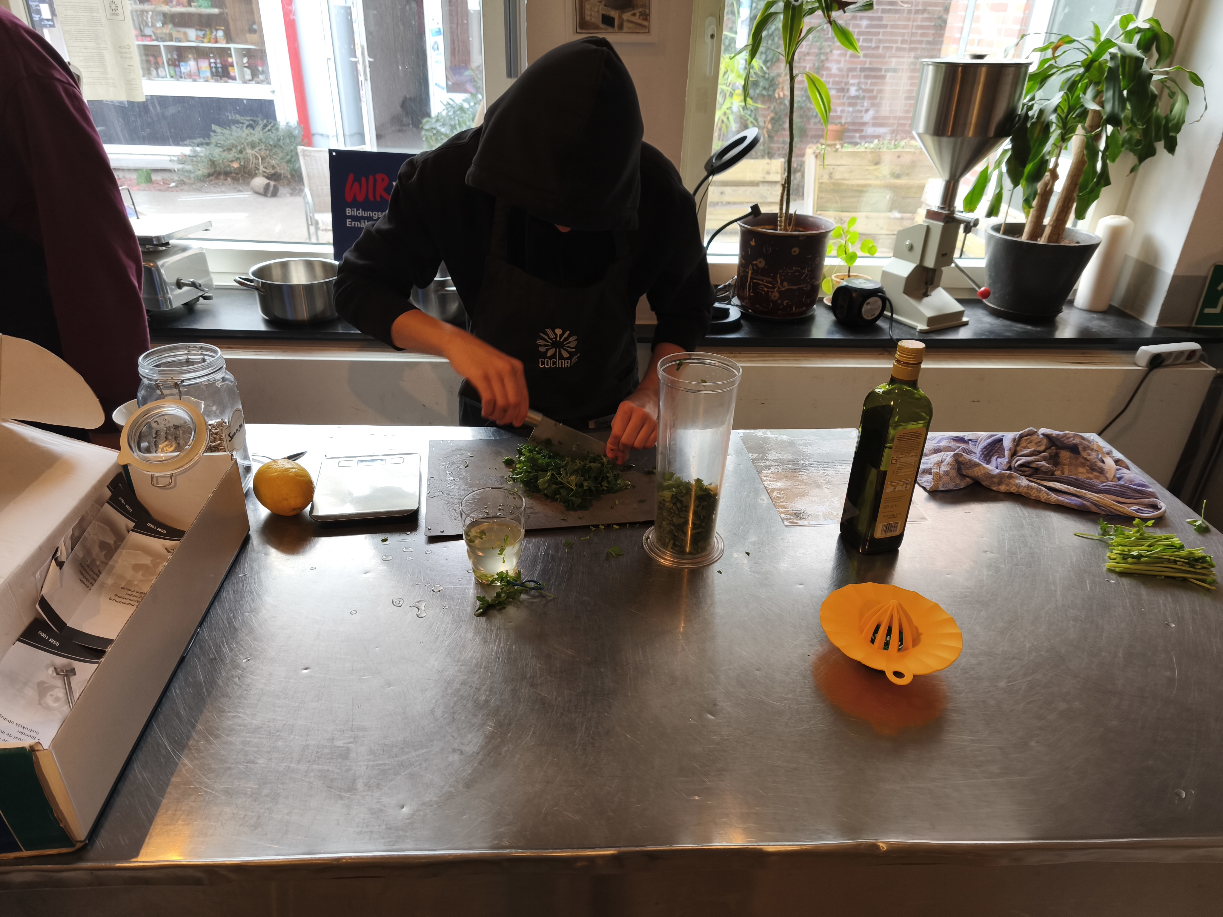 Am 03.02. ging es für den WPU Verbraucherbildung auf Exkursion in die Cocina Coworking Kitchen in die Alte Mu in Kiel. Zusammen haben sie einiges über den nachhaltigen Umgang mit Lebensmitteln gelernt und in Gruppen ein leckeres Mittagessen erstellt: Knäckebrot, Algenbrot; Joghurt-Dip, Petersilien-Pesto, Omelette-Muffins und als Nachtisch Kokos-Milchreis. Ein sehr gelungener Ausflug, der allen Spaß bereitet hat.