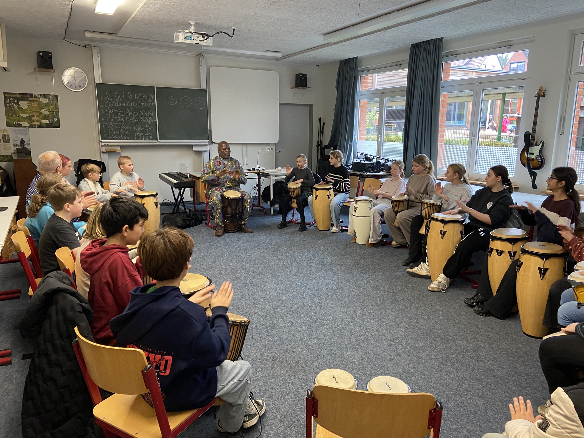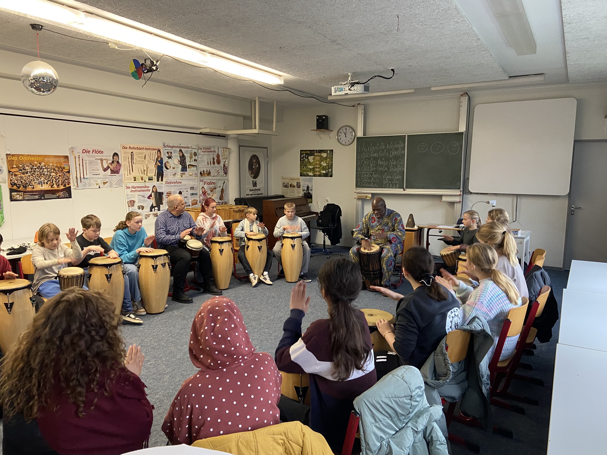 Auch in diesem Jahr kamen unsere Fünftklässler nach den Herbstferien in den Genuss, eine Unterrichtsstunde mit Morphius gemeinsam zu trommeln. Morphius kommt schon seit vielen Jahren zu uns an die Schule und begeistert unsere Schülerinnen und Schüler immer wieder mit neuen Rhythmen und Liedern an den Trommeln.