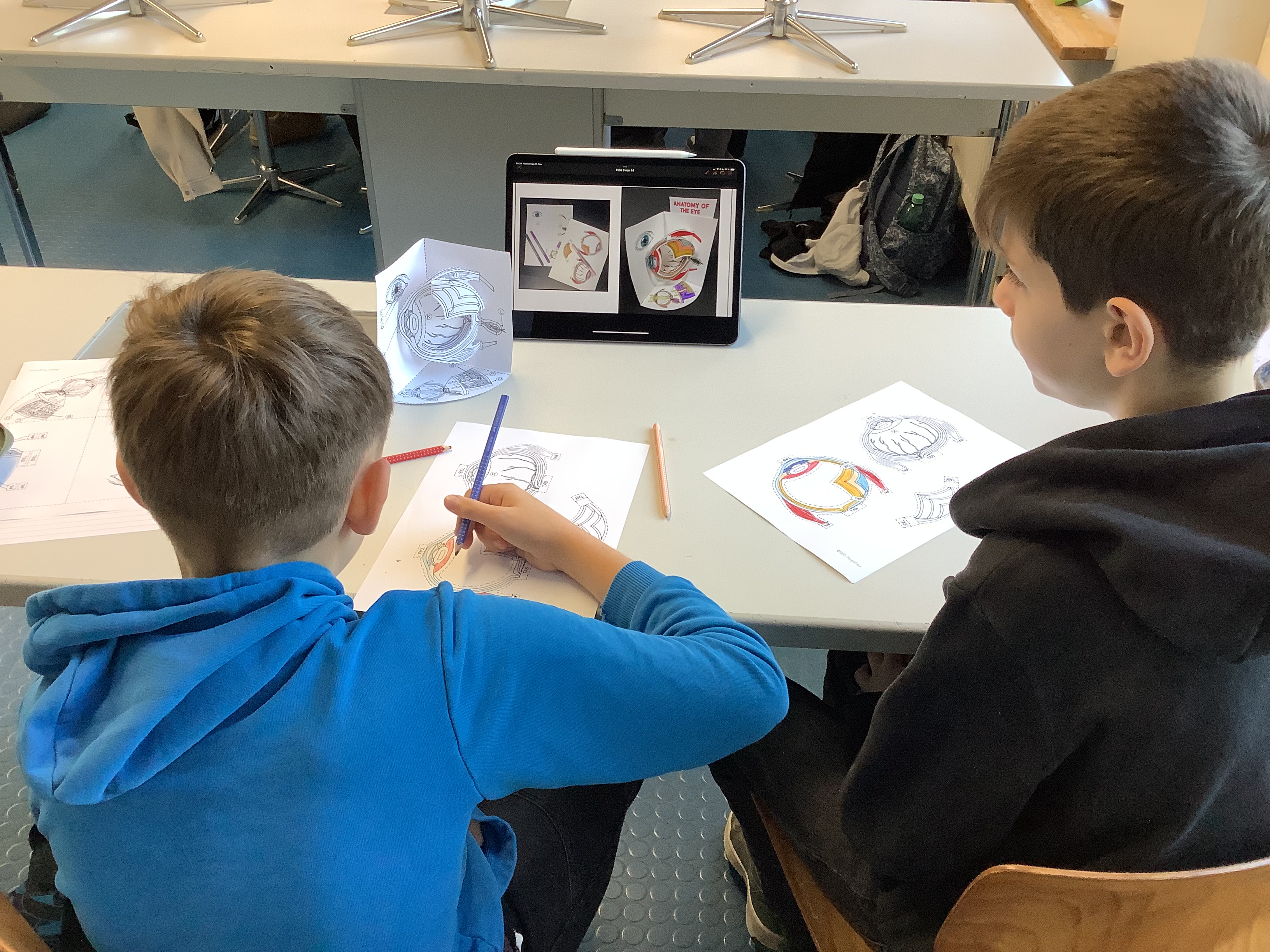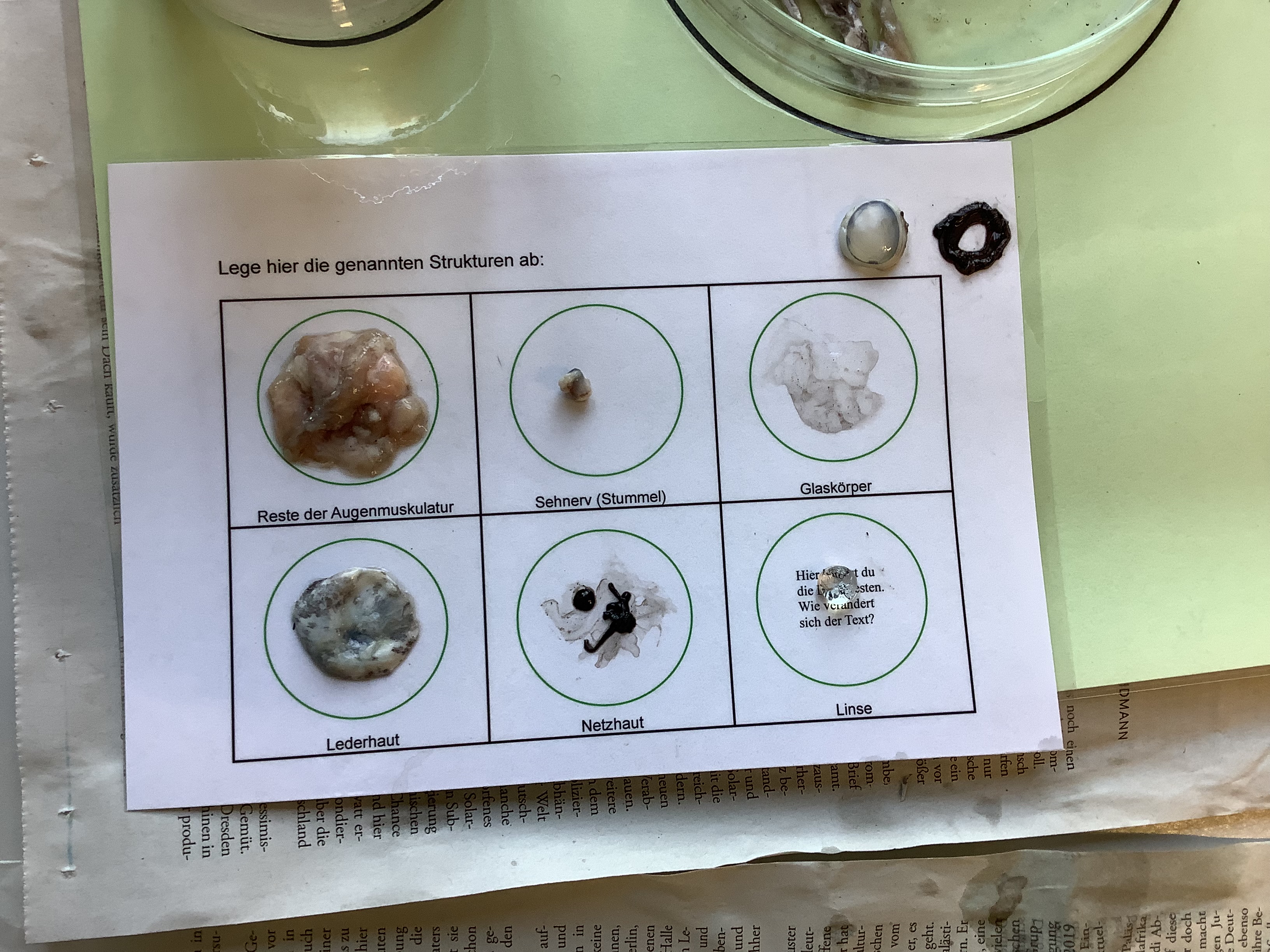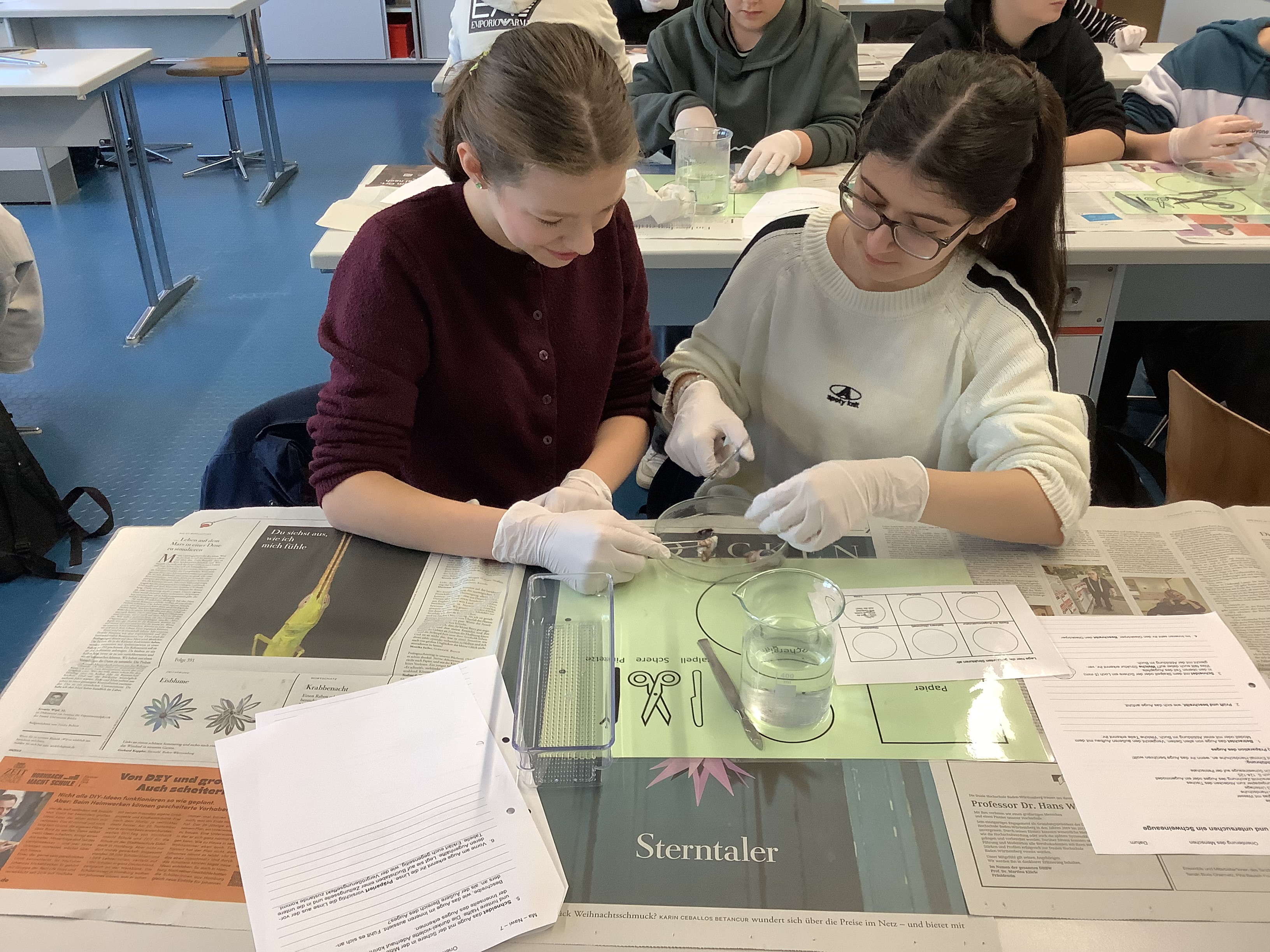 In den letzten Wochen haben die siebten Klassen im Rahmen eines NaWi-Projektes Schweineaugen seziert. Die Schülerinnen und Schüler erhielten dabei die Gelegenheit, den Aufbau des Auges praxisnah zu erkunden und theoretische Inhalte aus dem Unterricht vertieft nachzuvollziehen. Durch das sorgfältige Öffnen und Untersuchen der verschiedenen Strukturen wie Hornhaut, Linse und Sehnerv konnten sie biologische Zusammenhänge eigenständig entdecken. Das Projekt förderte nicht nur das Verständnis anatomischer Grundlagen, sondern auch konzentriertes Arbeiten, Teamfähigkeit und einen respektvollen Umgang mit wissenschaftlichem Material.